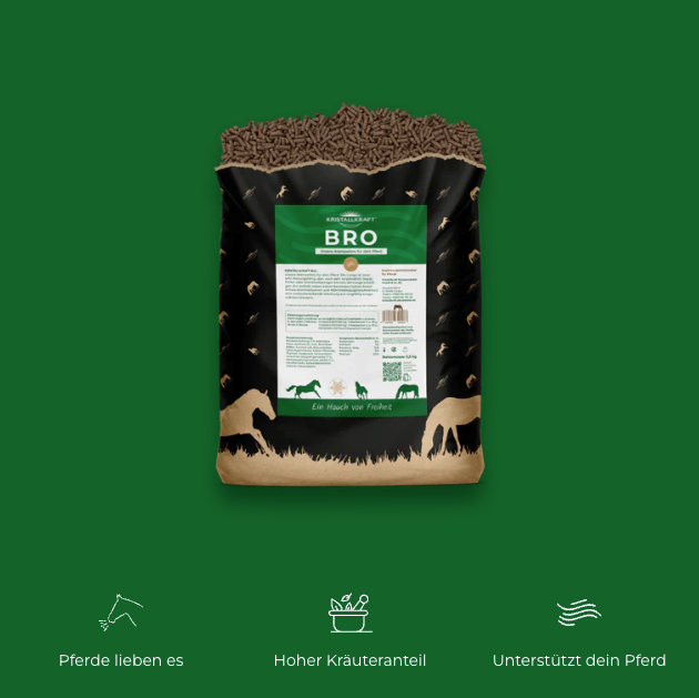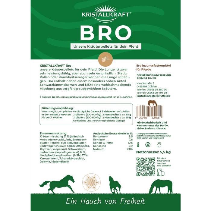 Hast du gewusst, dass jedes vierte Pferd einmal im Jahr an Husten leidet? Die Pferdelunge ist sehr staubempfindlich, ihre Funktionen sind abhängig von einer sauberen, staubfreien Umgebung und viel frischer Luft. Genau dies ist das Problem in vielen Ställen. Über die Fütterung kannst du dein Pferd unterstützen. Kristallkraft Bro in Form von staubfreien Pellets enthält neben einem besonders hohen Anteil Schwarzkümmel und MSM eine wohlschmeckende Mischung aus traditionellen Kräutern.
