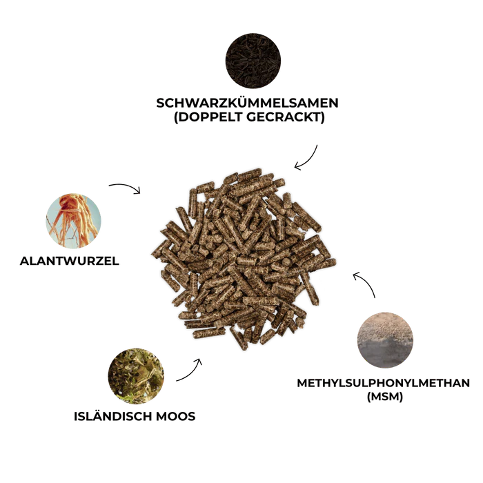 Kräutermischung 23% (Isländisch Moos, Alantwurzel, Anis, Brombeerblätter, Fenchel süß, Malvenblätter, Spitzwegerichkraut, Salbei Officinalis, Thymian, Ysopkraut), Schwarzkümmelsamen (doppelt gecrackt) 19%, Methylsulphonylmethan (MSM) 19%, Karottenmehl, Johannisbrotschrot, Mariendistelöl