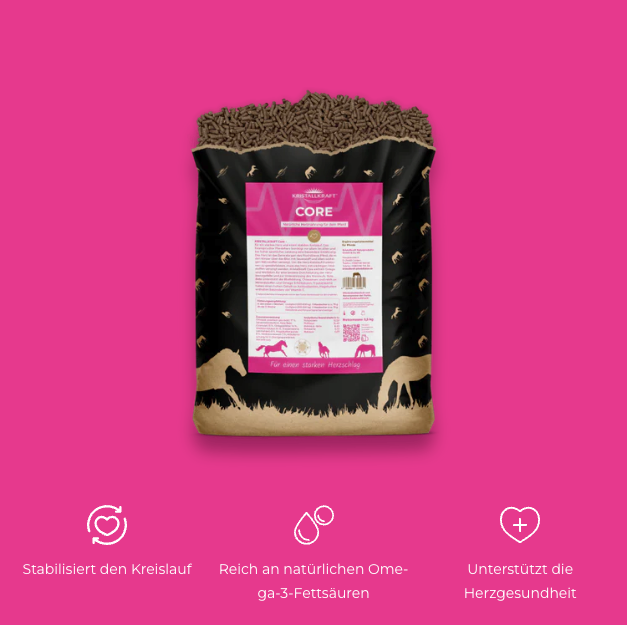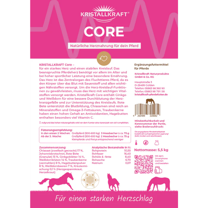 Die Natur stellt uns wertvolle Bausteine für die optimale Herzernährung zur Verfügung. Hierzu gehören neben Weißdorn auch Gingko, Herzgespann und Herzelkraut (Hirtentäschel). Sie fördern die Durchblutung und sind reich an herzstärkenden Vitaminen und Mineralien. Kristallkraft Core versorgt das müde Pferdeherz mit den wichtigsten Herzkräutern und Vitalstoffen für ein langes Pferdeleben mit hoher Lebensqualität. Kristallkraft Core stellen wir in einem selbst entwickelten besonderen Schonverfahren in unserer Hofmanufaktur her, damit alle sensiblen Inhaltsstoffe voll erhalten bleiben. Die Pellets werden gerne gefressen und lassen sich leicht füttern.