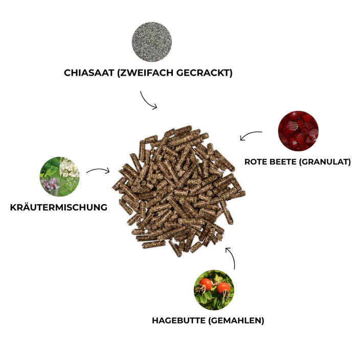 Herzprobleme beim Pferd werden häufig durch das Zusammenspiel von hoher Belastung und Mangelernährung verursacht. Damit die Herz-Kreislauf-Funktionen reibungslos ablaufen, muss das Pferd ausreichend mit Vitalstoffen versorgt werden. Arterienverkalkung, oxidativer Stress durch freie Radikale und erhöhte Viskosität machen den Herzgefäßen zu schaffen. Damit das Herz lange jung bleibt, benötigt es eine optimale Sauerstoffversorgung durch gute Durchblutung der Herzkranzgefäße sowie eine Ernährung, die der Verkalkung entgegenwirkt. Chiasaat ist reich an Kalium und Magnesium sowie natürlichen Omega-3-Säuren, die das Herz-Kreislaufsystem stärken. Bekannt für seine zellschützende Wirkung ist neben Vitamin E und C das sogenannte OPC, welches in hoher Konzentration in Traubenkernen enthalten ist. So werden freie Radikale gebunden und oxidativer Stress gemindert.