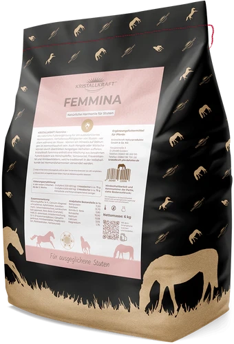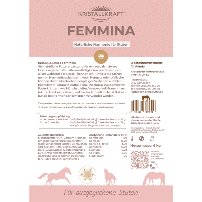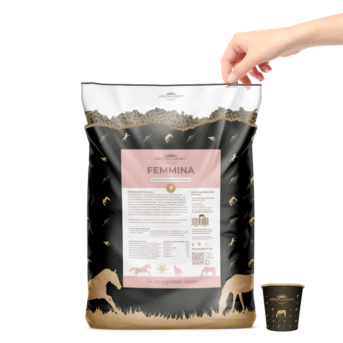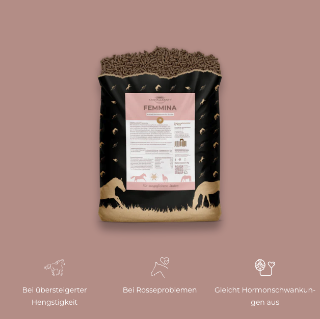 Kristallkraft Femmina enthält eine Mischung aus bewährten Hormonkräutern wie Mönchspfeffer und Frauenmantel sowie Mineralien und Spurenelementen zu Ausgleich von Dysbalancen des Hormonhaushalts. Fällt die rossige Stute durch Verhaltensänderungen wie Zickigkeit, Quietschen, Schlagen, und Arbeitsunwilligkeit auf, kann Kristallkraft Femmina für Ausgleich und Harmonie sorgen. Aber auch bei übertrieben dominantem Verhalten von Hengsten kann Kristallkraft Femmina für Abhilfe schaffen, ohne die Fruchtbarkeit zu gefährden. Hengstige Wallache können ebenfalls beruhigt werden.
