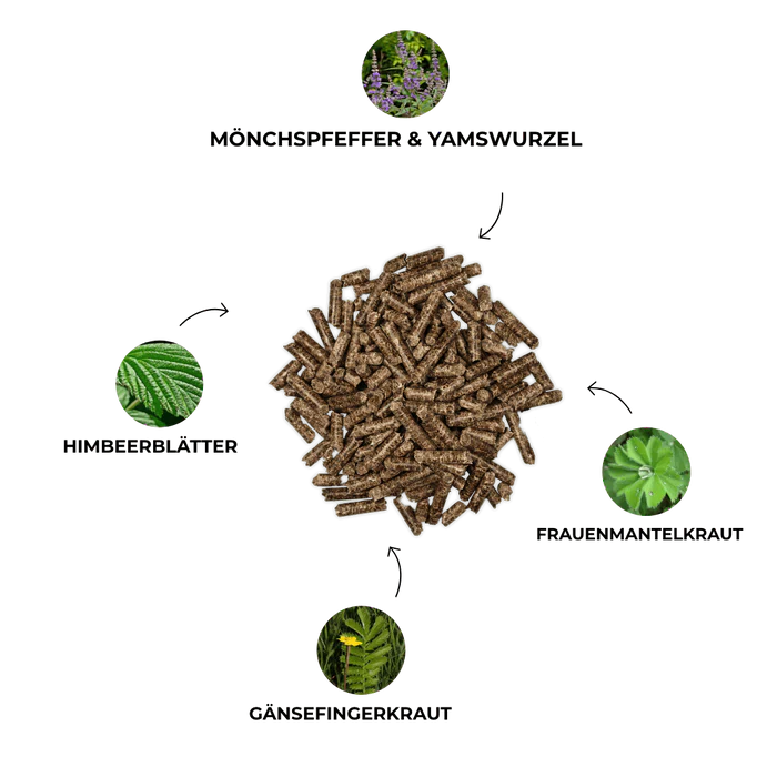 Mönchspfeffer 14%, Calcium-Magnesiumcarbonat, Apfeltrester, Karottenmehl, Johannisbrotschrot, Leinkuchen kalt gepresst, Rote Beete (Granulat), Hefe (S. cerevisiae), Kräutermischung 1,5% (Frauenmantelkraut, Gänsefingerkraut, Himbeerblätter, Hopfenblüten, Rotkleeblüten, Yamswurzel)
