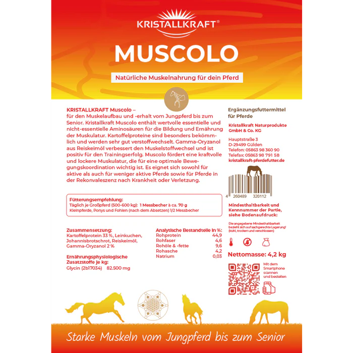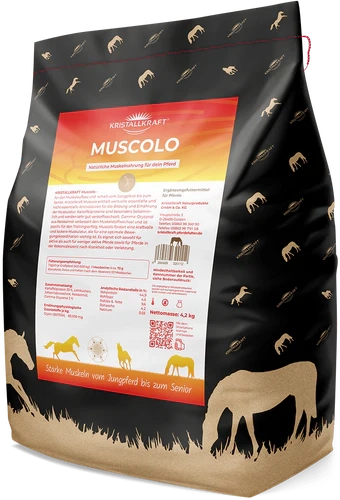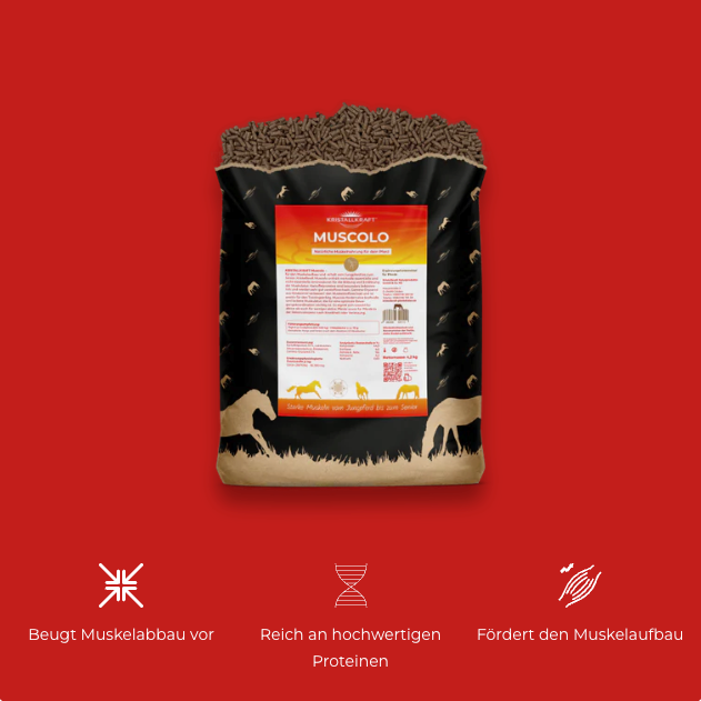 Mit Kristallkraft Muscolo bekommst du die ideale Nahrungsergänzung für einen natürlichen Muskelaufbau deines Pferdes und gleichzeitig einen zuverlässigen Schutz vor Muskelabbau in kritischen Lebenssituationen. Nur eine starke Muskulatur schenkt unseren Pferden dieses besondere Strahlen und majestätische Aussehen. Um diese aufzubauen, benötigen Pferde neben freier Bewegung mit Artgenossen und regelmäßigem Training auch eine passende Muskelnahrung.
